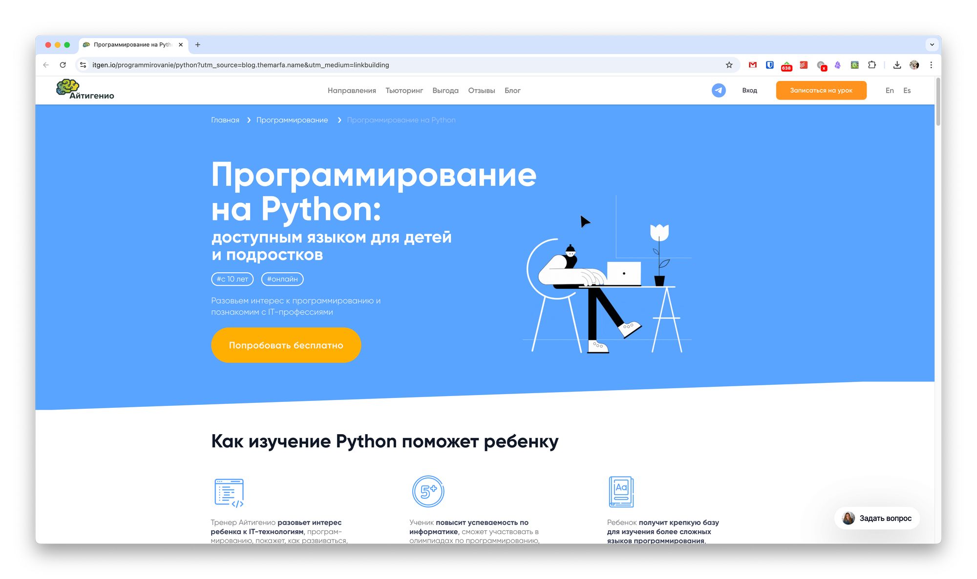 Выбор языка зависит от интересов ребёнка: создание игр, сайтов, робототехники или чего-то другого, например приложений для Android, веб-приложений. Чаще всего в качестве первого языка выбирают именно Python. Пример программы обучения и навыков, которые приобретает в этом случае ребёнок — https://itgen.io/programmirovanie/python?utm_source=blog.themarfa.name&utm_medium=linkbuilding.