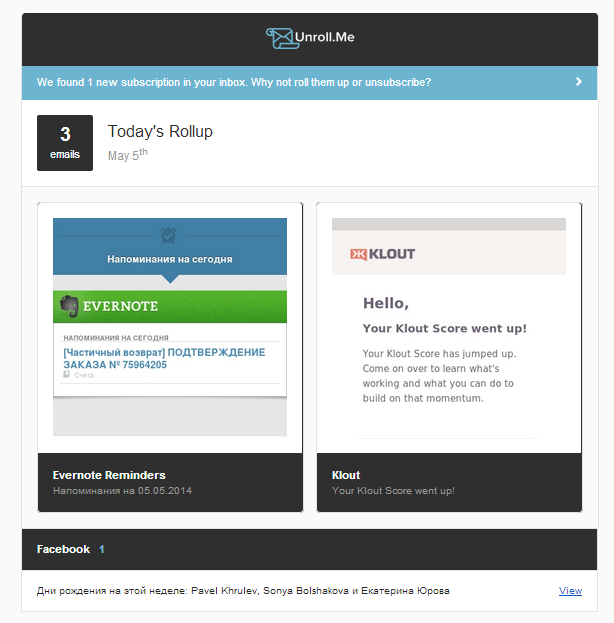 Unroll.me - просто позволяет получать все новостные рассылки в одно время и одним письмом.