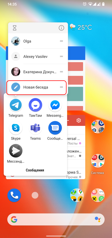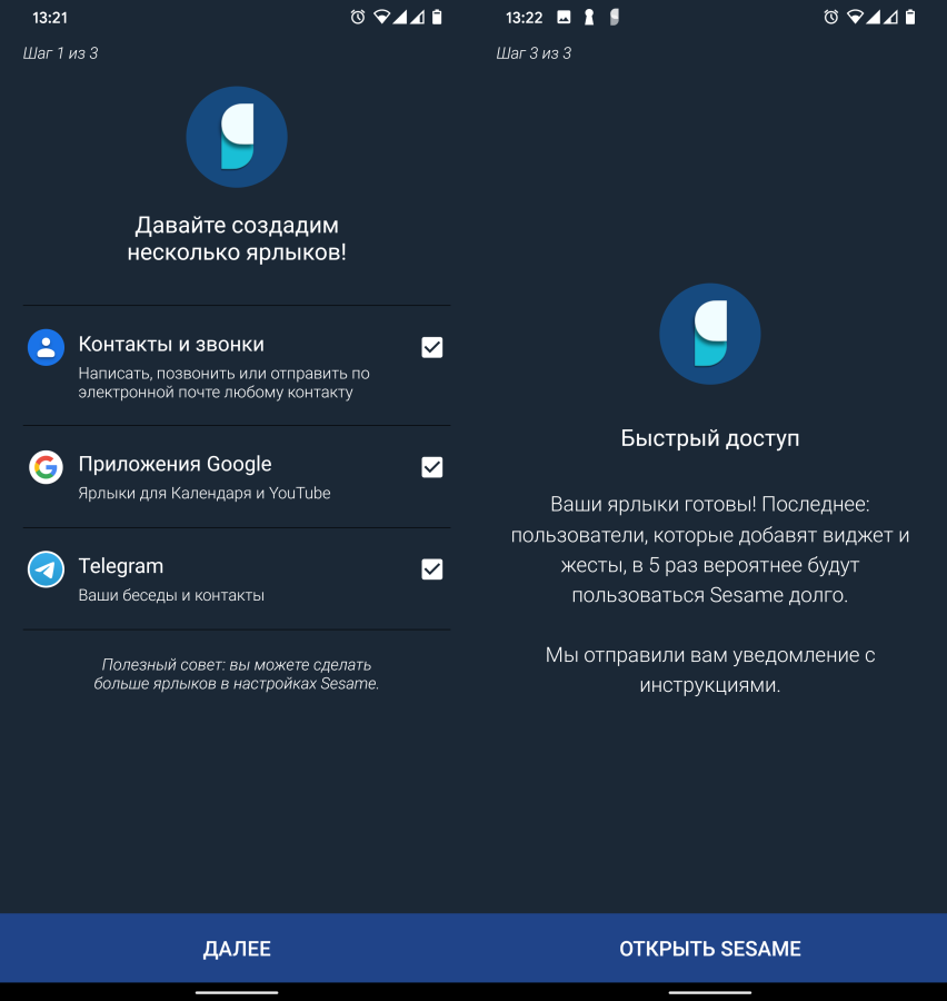 При первом запуске Sesame автоматически создать несколько полезных ярлыков. По умолчанию это контакты и звонки, приложения от Google и в моём случае Telegram.
