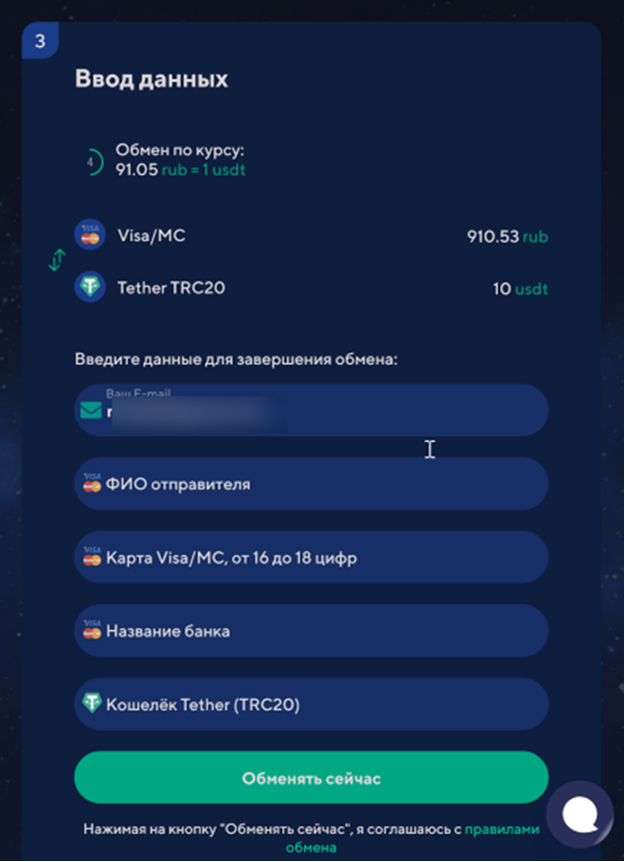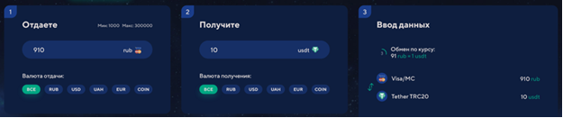 Например, вы собираетесь приобрести с рублёвой карты Mastercard 10 USDT. Для этого нужно выбрать соответствующий обмен и обозначить сумму, которую вы хотели бы получить. Система автоматически определит курс и сообщит сумму для оплаты.