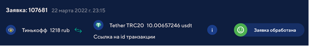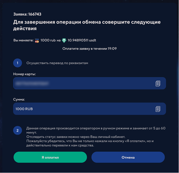 Оплатить нужно за определённое время, после этого подтвердить оплату соответствующей кнопкой. Далее примерно через 5 минут (иногда в течение часа) денежные средства поступят на указанные реквизиты. Статус своей заявки можно отслеживать в системе.