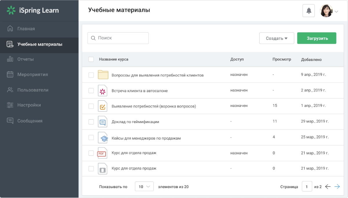 Хранить учебные материалы. Вы можете загрузить туда всё что угодно и быть уверенными, что ваши клиенты на той стороне увидят эти материалы и будут пользоваться. Загрузите презентации, таблицы, книги в основных форматах, опросы, документы и так далее. Это всё будет храниться в облаке сервиса или на сервере вашей компании.