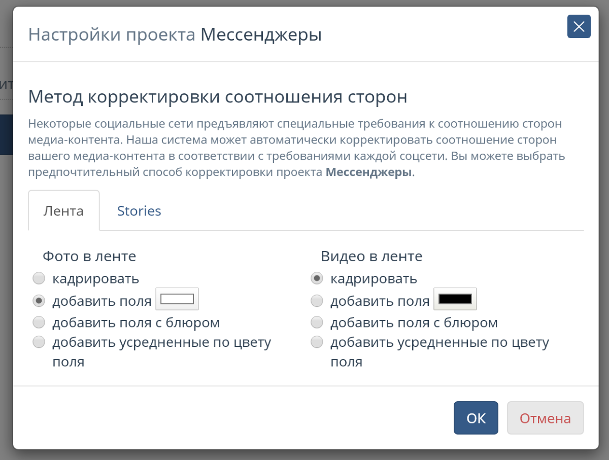 В настройках проекта можно указать параметры корректировки соотношения сторон для изображений. Для обычной ленты и Stories настройки разделены.