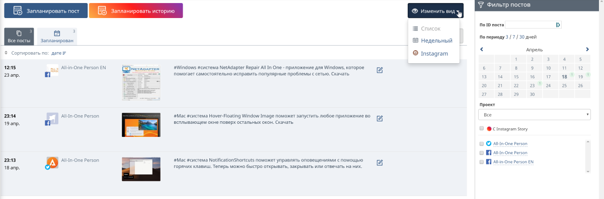 У планировщика есть несколько видов отображения: список, как выше, недельный и Instagram-стайл. Когда количество постов превысит все мыслимые значения, их можно будет легко найти с помощью встроенного фильтра и календаря.