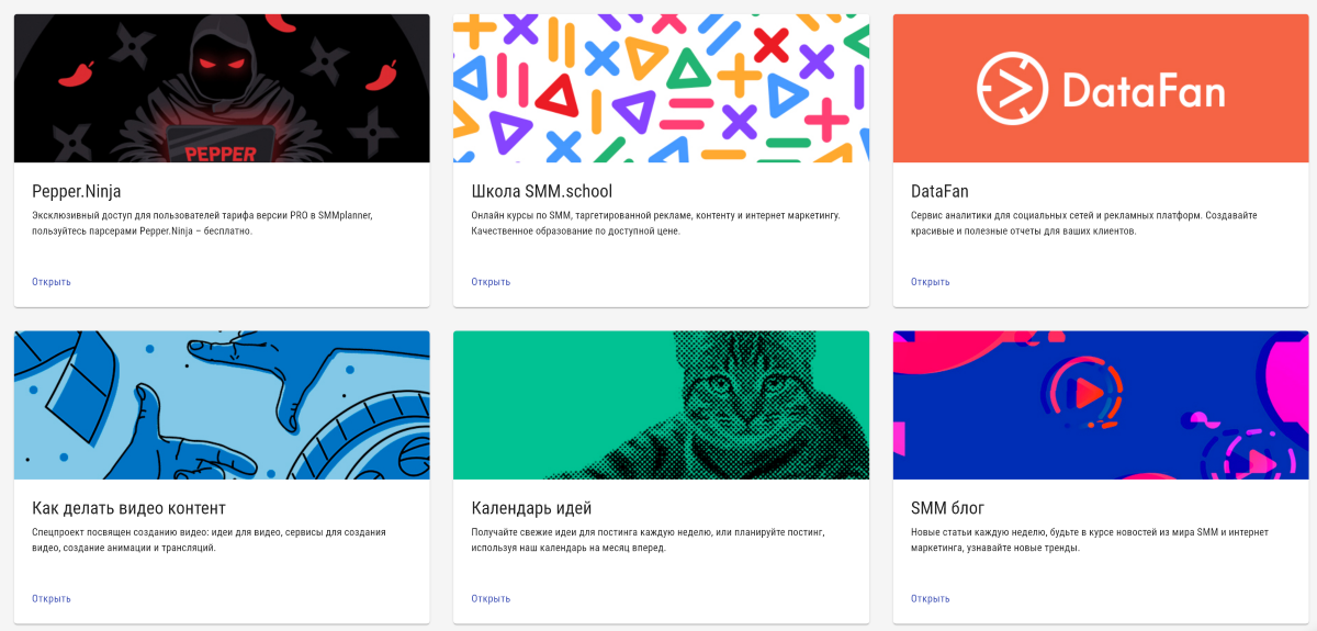 Следующий раздел имеет небольшое отношение к автопостингу. В «Промо» содержатся полезные предложения от партнёров SMMplanner. Например, доступ к парсеру Pepper.Ninja, или курсы по SMM.
