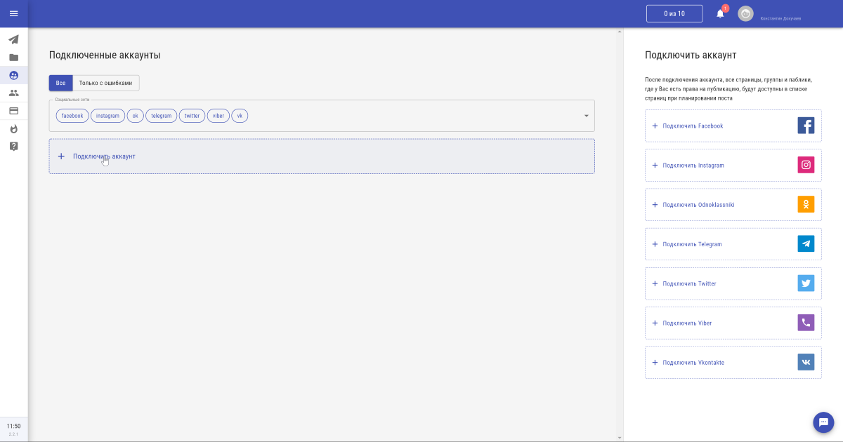 Аккаунты подключаются из соответствующего раздела нажатием на соответствующую плашку. После чего нужно разрешить доступ сервису, и он будет доступен для автопостинга.