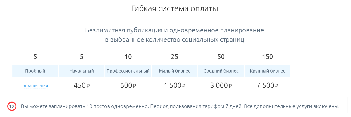 Тарифная сетка SMMplanner гибкая и зависит от количества подключенных социальных сетей.