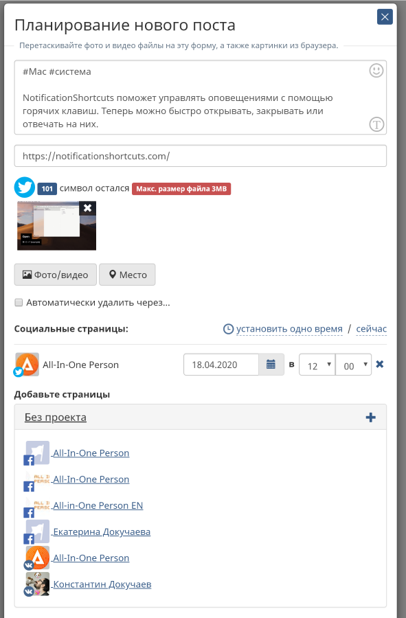 В конце нужно выбрать проекты, куда пост будет опубликован. Проектами здесь называются ваши социальные сети. Одновременно можно выбрать любое количество подключенных групп. Можно задать им всем одно время публикации или указать каждой своё. Дополнительно можно указать, через сколько удалить пост.