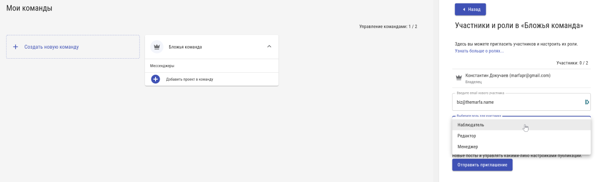 Если над социальными сетями компании работает несколько человек, вам понадобится раздел «Команды». Здесь можно настроить права доступа для каждого участника в каждом проекте.