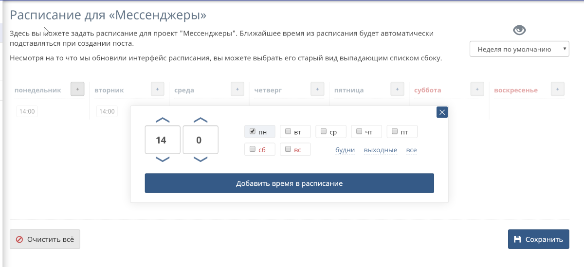 Здесь же можно создать для проектов индивидуальное расписание. Тогда новые посты автоматически будут планироваться для публикации в соответствии с расписанием проекта.