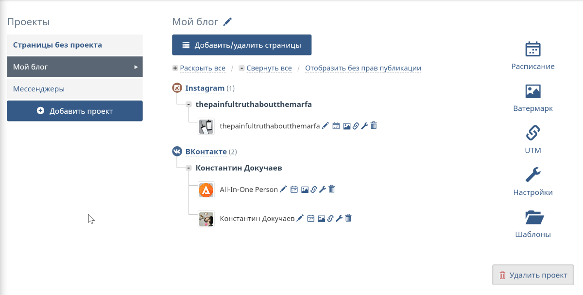 По сути это папки или категории, по которым вы хотите разделять социальные сети. Например, я сделал проект «Мой блог», добавив в него социальные сети. А в проект «Мессенджеры» добавил Телеграм и Viber.