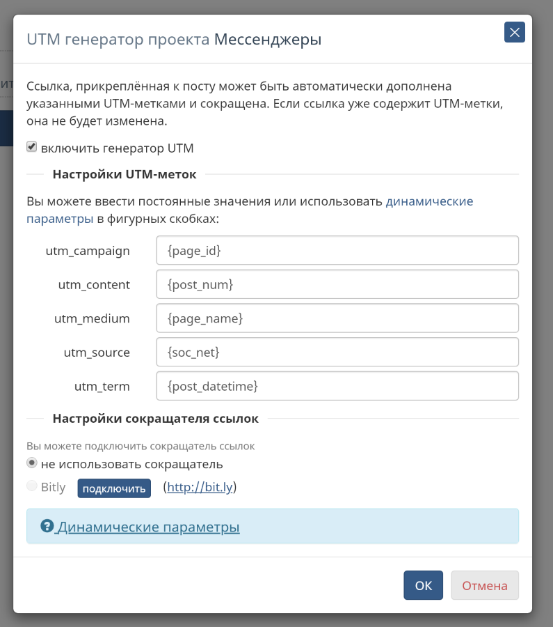 В специальном редакторе вы указываете необходимые параметры UTM-кампании. Можно использовать динамические и статические. Если у поста есть свои метки, они не будут изменены. Также можно подключить сокращатель ссылок.