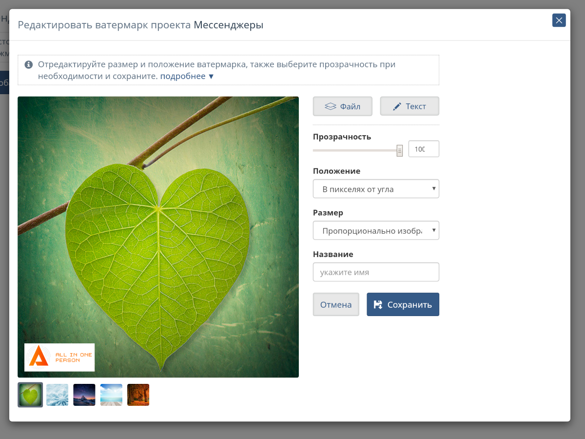 Если вы ведёте фотопроект (или просто переживаете за авторские права), к постам можно автоматически добавлять фото или текстовую вотермарку. Просто добавьте её в настройках проекта, указав параметры её отображения. Все запланированные посты будут выходить уже с ней.