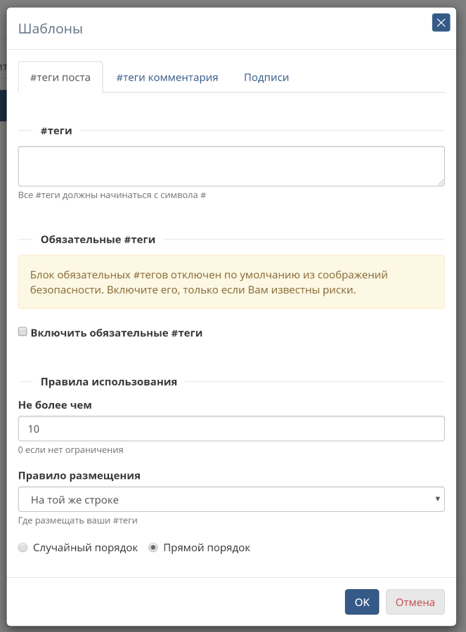 В шаблонах можно настроить автоматическое добавление подписи, а также тегов к постам и комментариям. Вы сами выбираете доступные теги, указав правила их использования.