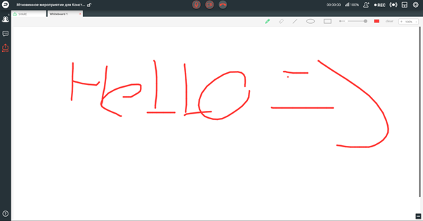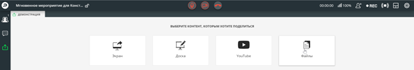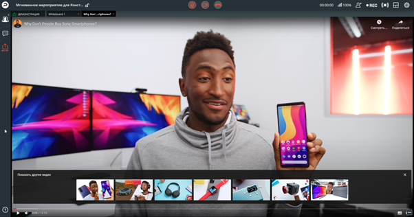 Интересно, что если вы решили показать и доску, и видео, и файл, то вы сможете на лету переключаться между окнами. Каждая демонстрация — это отдельная вкладка текущей конференции.