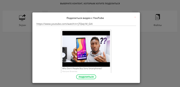 К примеру, в разделе «Демонстрации», помимо экрана, можно выбрать показ доски для рисования, видео на YouTube или файла.