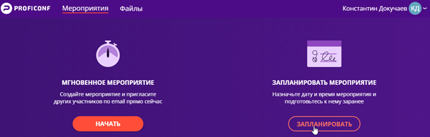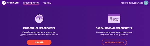 Для того чтобы создать конференцию в Proficonf, достаточно авторизоваться в сервисе через браузер (можно даже на мобильном устройстве) и создать или мгновенное мероприятие, или запланированное.