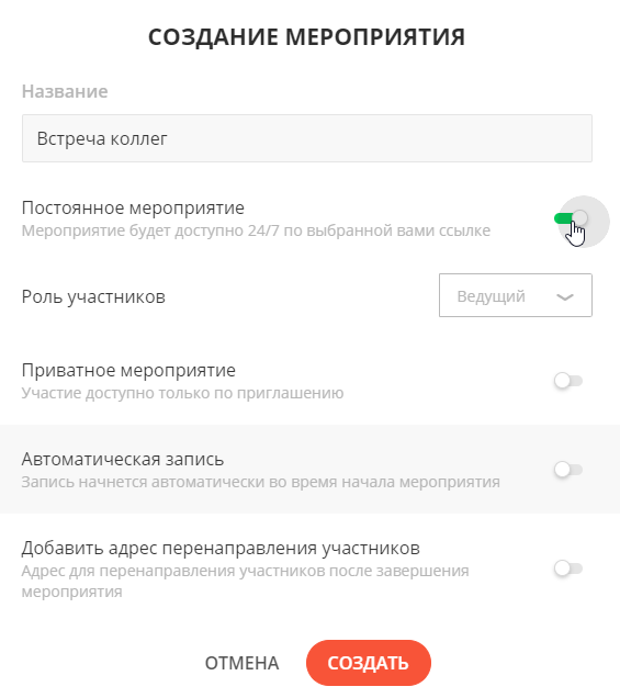 И на следующем шаге просто включите тумблер «Постоянное мероприятие». Заполните нужные данные, добавьте коллег, и готово.
