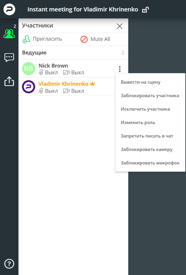 Ведущий может управлять только своим микрофоном и камерой, выступать с докладом, загружать файлы, демонстрировать экран и тому подобное.