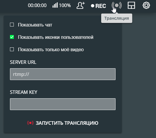 Конференцию можно транслировать в популярные живые эфиры YouTube, Facebook или ВКонтакте.