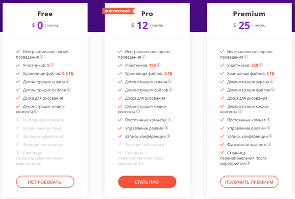 Базовые возможности вроде неограниченного времени проведения конференции доступны на всех тарифах.