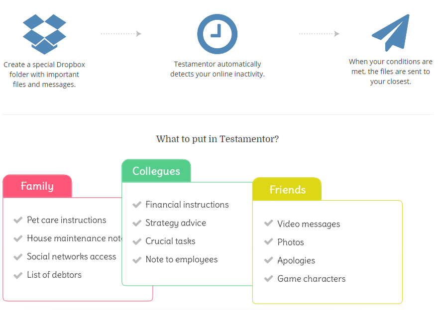Современное поколение предпочитает хранить самые важные файлы в различных «облачных» хранилищах. Но вы задумывались, что с ними будет после вашей смерти? Например, в Dropbox с этой проблемой поможет справиться Testamentor. С помощью данного сервиса (в случае смерти) пользователь может настроить автоматическую отправку своих файлов.