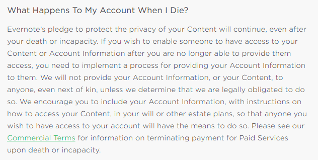 У Evernote нет каких-либо специальных инструментов по предоставлению доступа к вашим данным. Однако в их пользовательском соглашении чётко прописано, что вам необходимо юридически оформить право доступа к аккаунту после вашей кончины.