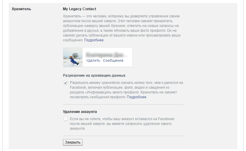 В Фэйсбук в разделе настроек безопасности вы можете найти функцию «Хранитель». В ней нужно указать аккаунт вашего родственника, который позаботится об аккаунте после смерти. Или вы можете настроить автоудаление аккаунта.