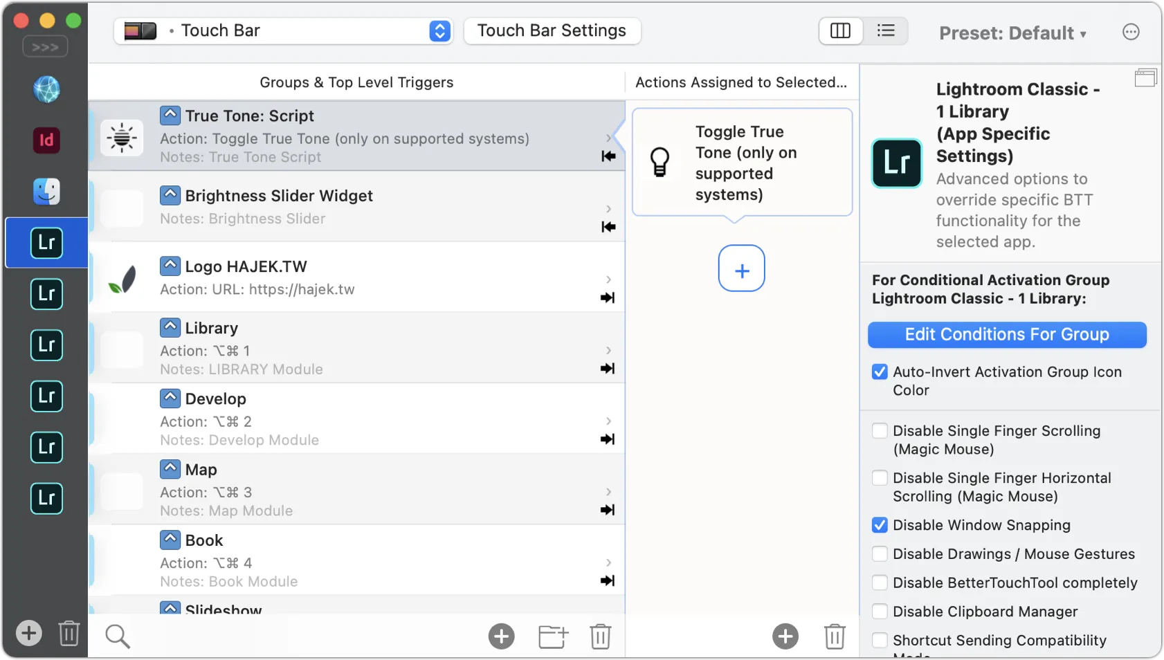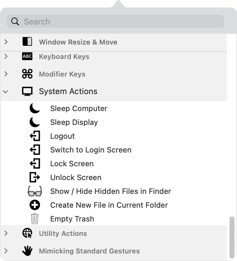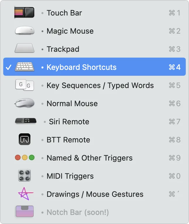 Дополнительные жесты можно создать под любое устройство ввода, будь то обычная мышка, Magic Mouse, трекпад, клавиатура или Touch Bar. Кроме этого, поддерживаются: пульт Siri Remote, MIDI-контроллеры и даже BTT Remote.