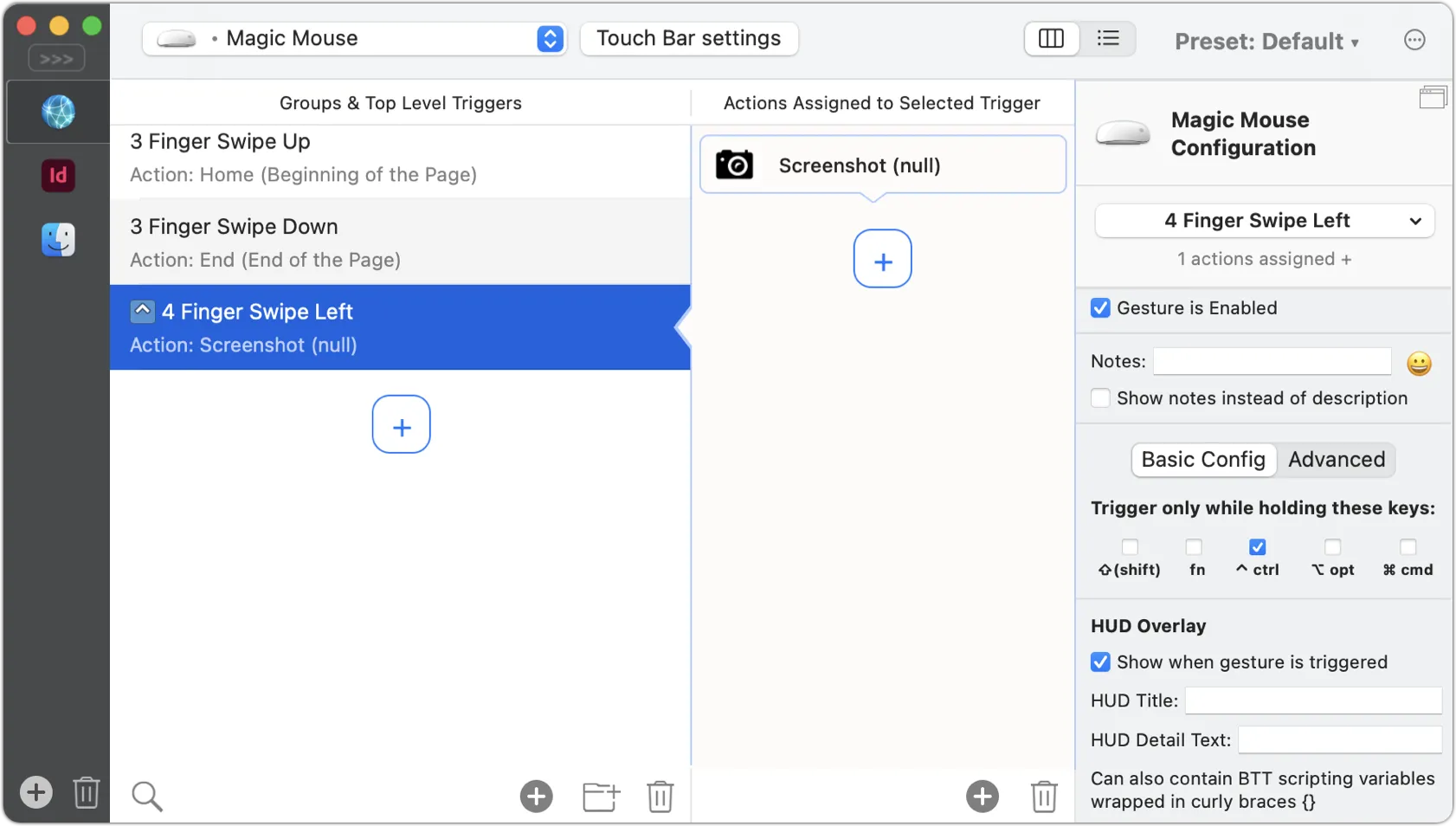 Я начал пользоваться BetterTouchTool с тех пор, как Apple убрала из Mac некоторые удобные для меня жесты (например, свайп тремя пальцами вверх и вниз). Программа оказалась легка в использовании и помогла в несколько кликов создать свой собственный сетап жестов.