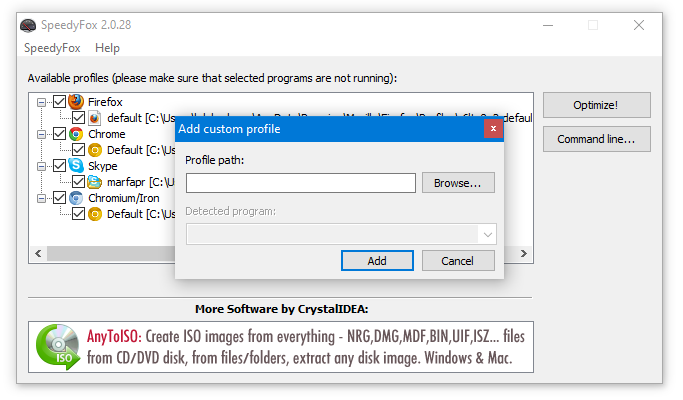 Если SpeedyFox не нашёл профиль поддерживаемой программы, то его можно указать вручную с помощью настроек.