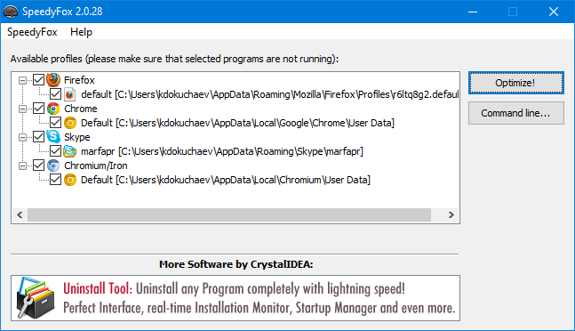 Фишка программы в том, что пользовательские профили — это базы данных SQLITE и для них актуальны те же проблемы, что и для настоящих баз. Например, фрагментация данных. После запуска дефрагментации таблицы становятся меньше по размеру, а браузеру проще найти нужную информацию.