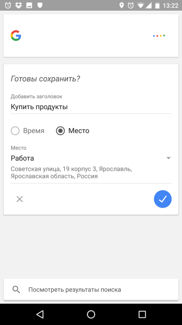 При постановке задач можно использовать «расплывчатые» фразы типа «Купить продукты завтра, когда я буду на работе». Google знает про нас всё и знает, где у вас работа, а где дом. В большинстве случаев распознавание имен, мест и времени работает идеально и вам действительно не нужно прикасаться к смартфону или смотреть на него.