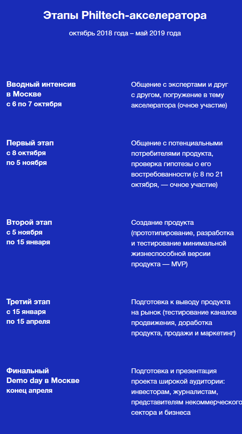 Основная часть акселерационной программы Philtech пройдёт в дистанционном формате. Но будьте готовы участвовать очно в вводном интенсиве (6-7 октября) и в начале первого этапа акселерации (8-21 октября).