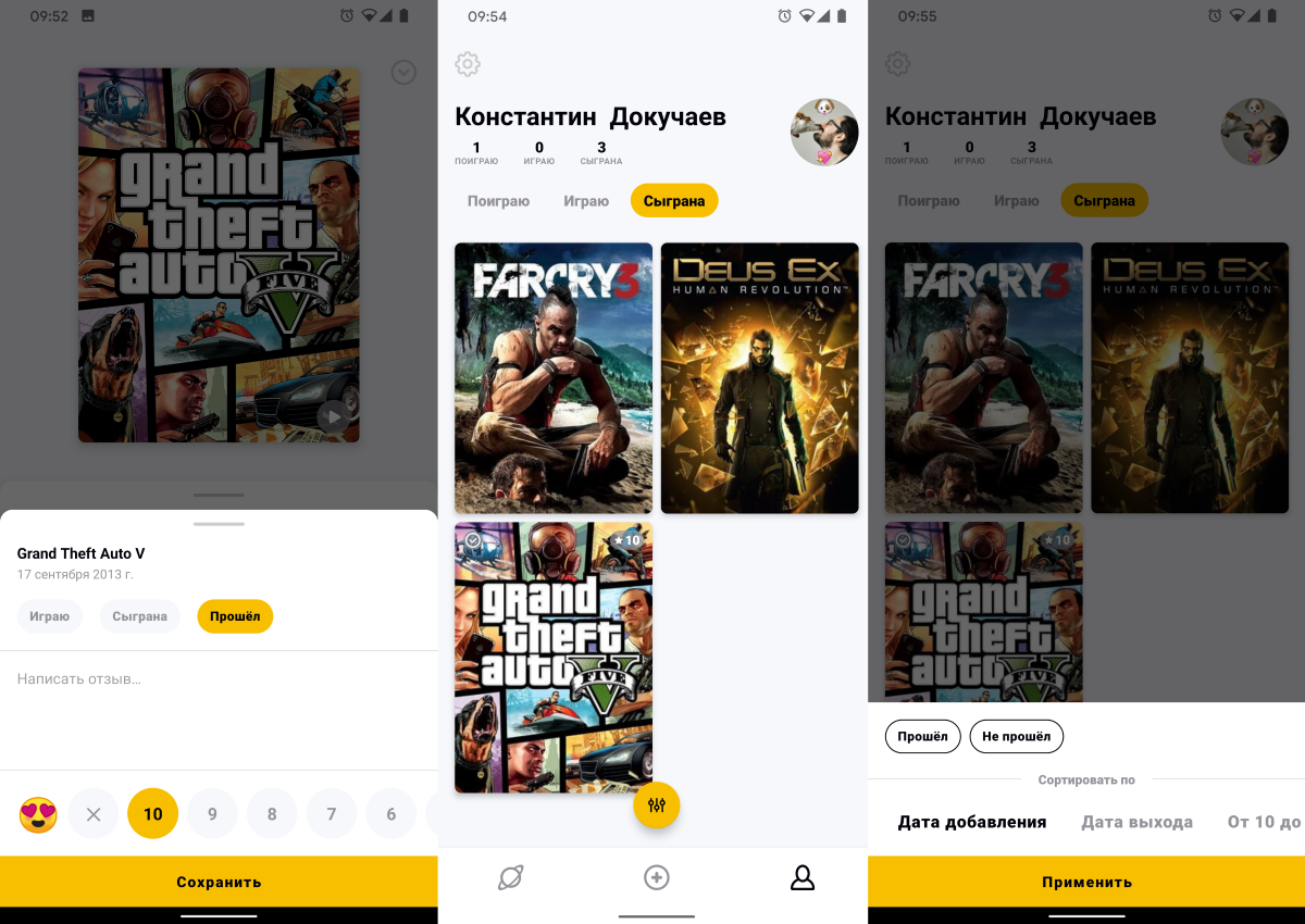 При добавлении игры можно добавить отзыв, оценку и эмодзи. А в коллекции можно сортировать игры по статусу прохождения, дате добавления, выхода, оценке и другим параметрам.