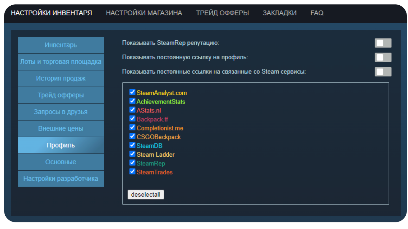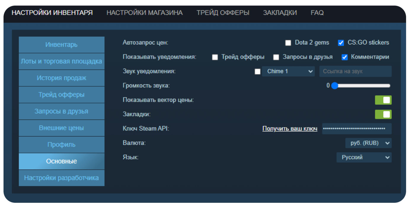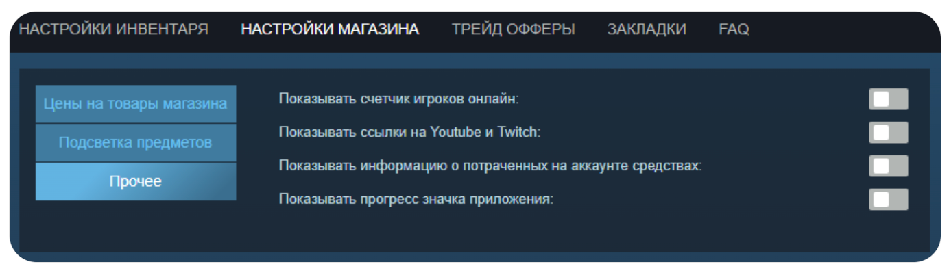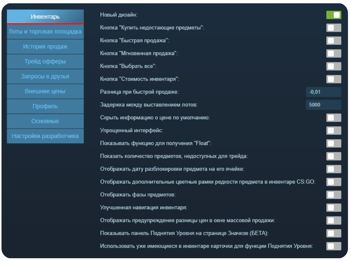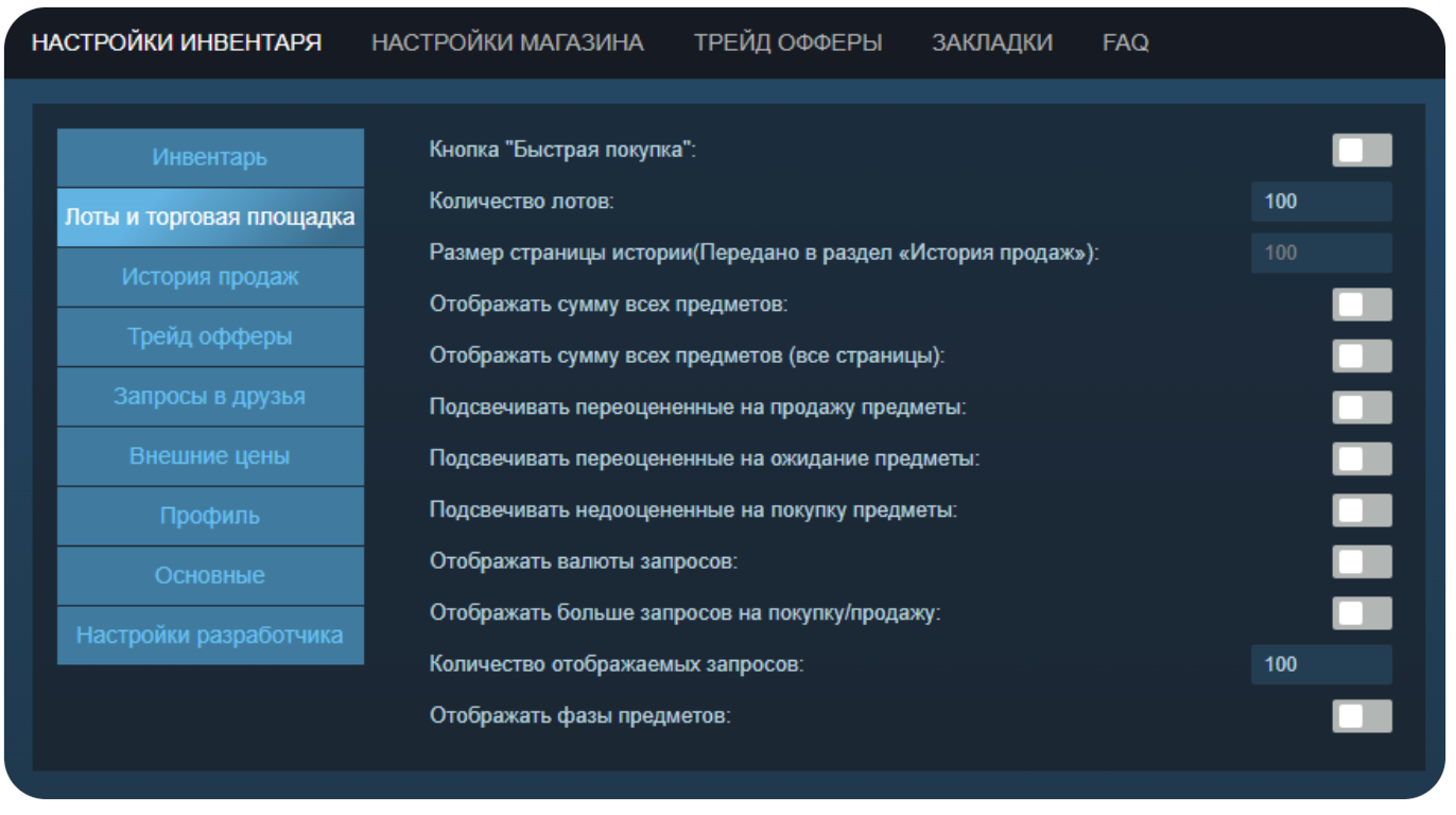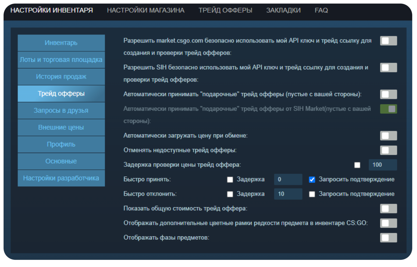 Здесь всё интуитивно понятно и не требует детального пояснения. Если вы редко используете трейды и не взаимодействуете с сервисом MarketCSGO, практически все параметры можно отключить. Первые две функции актуальны исключительно при использовании этого сайта.