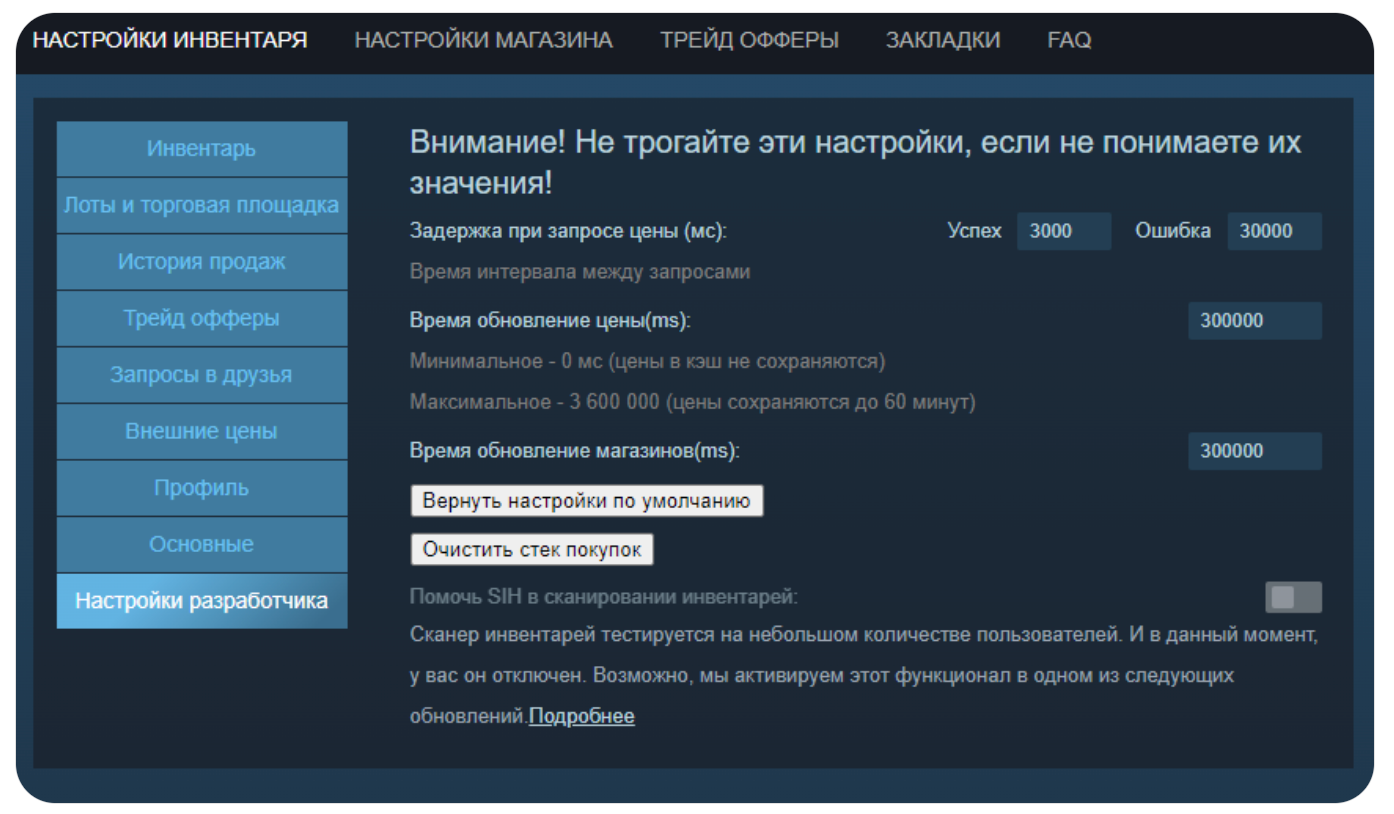 На этом разбор основных функций Steam Inventory Helper завершён. Далее можно перейти к индивидуальным настройкам, которые позволяют пользоваться расширением более безопасно и значительно реже сталкиваться с микробанами.