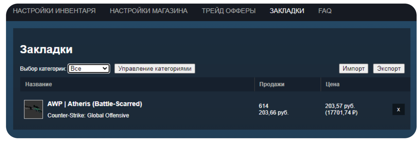 В закладках сохраняются предметы, которые отслеживает пользователь. Это удобно для мониторинга цен.