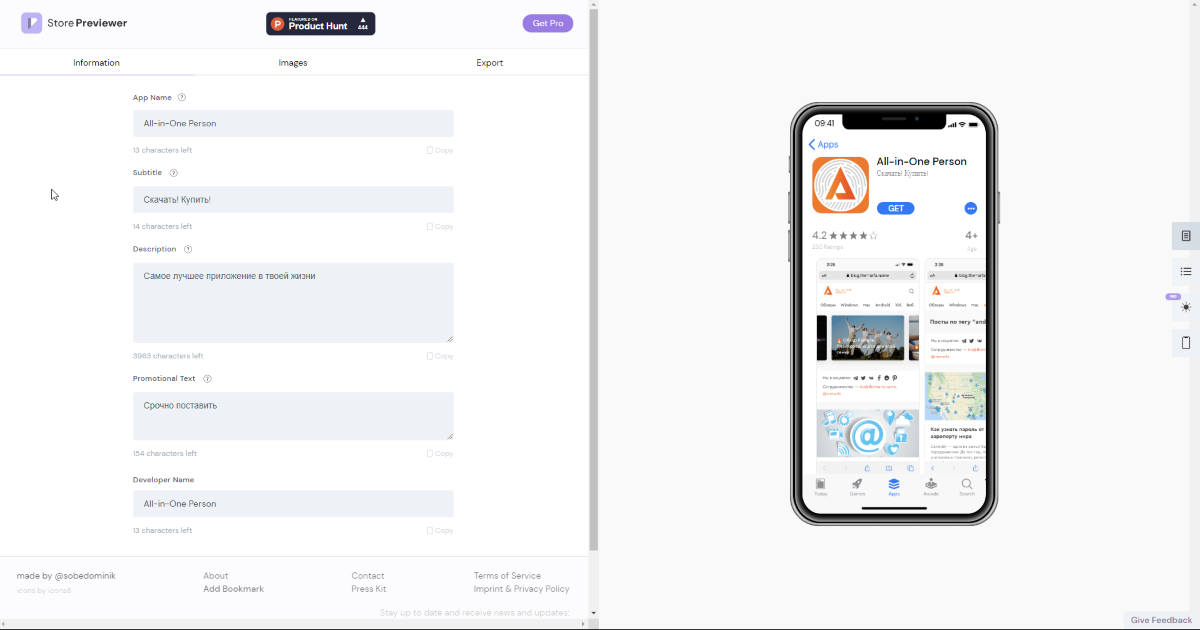 В веб-интерфейсе нужно заполнить основную информацию о своём приложении, добавить скриншоты для различных моделей iPhone. После чего справа в реальном времени вы сможете увидеть как будет выглядеть ваше приложение в App Store.