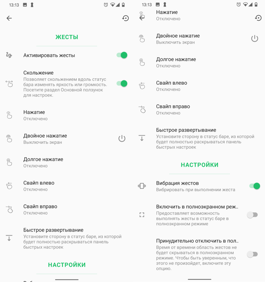 Всего предусмотрено шесть настроек: жесты, индикаторы, ползунок, бегущая строка, статус бар, батарея и дополнительные параметры.