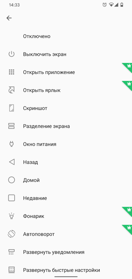 По тапу или нажатию можно выбрать выполнение других действий. Например, выключение экрана, запуск приложений, снятие скриншотов и многое другое.