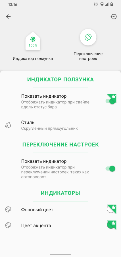 В разделе индикаторы можно настроить визуальный вид ползунка, который отображается при свайпе, а также иконки переключения настройки.