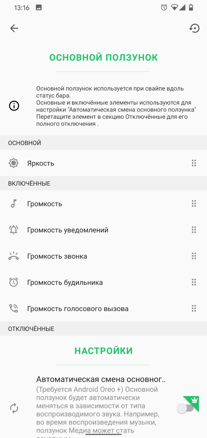 Доступные действия можно включить или отключить в разделе Основной ползунок.