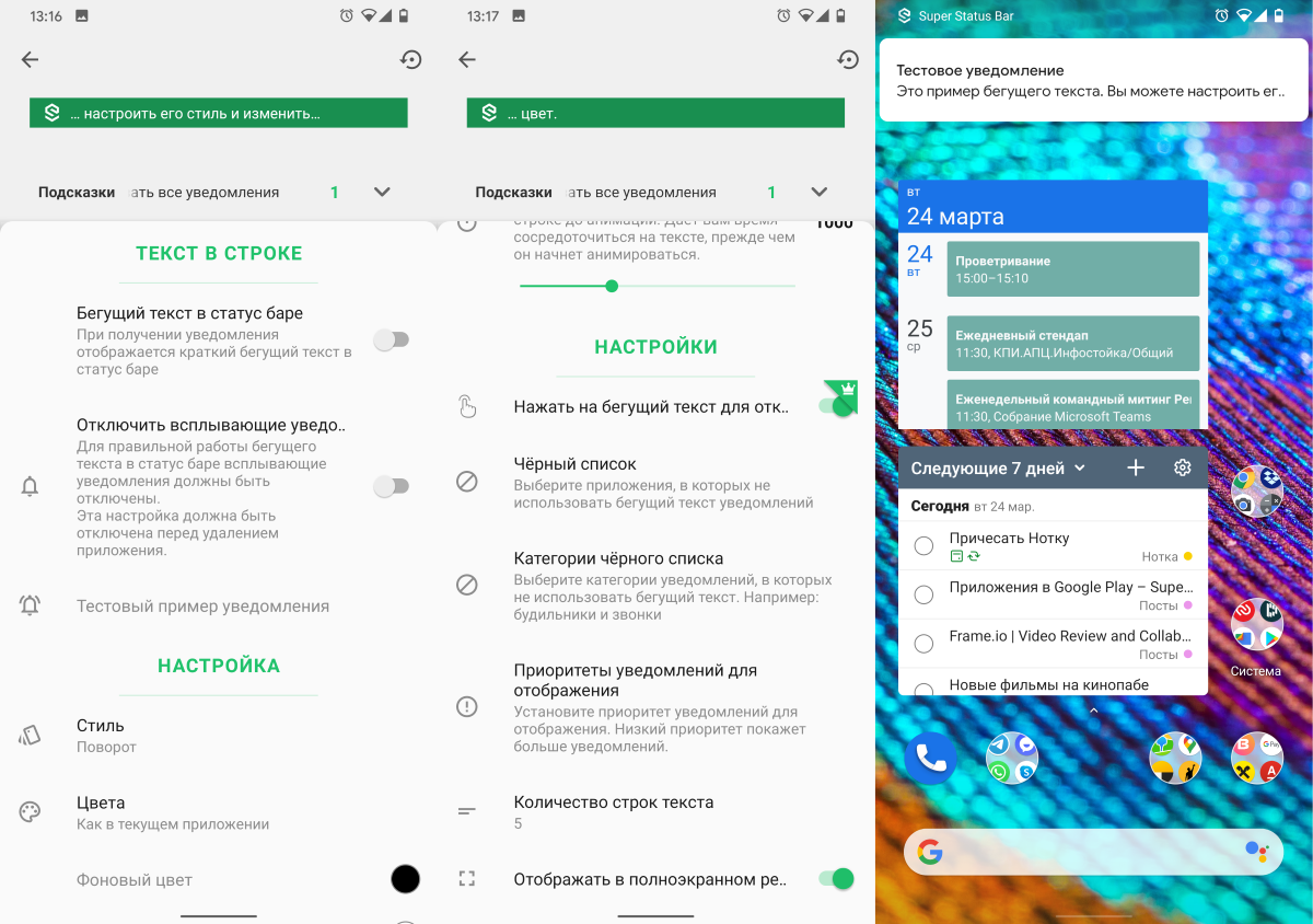 Как и остальные параметры, бегущую строку можно настроить. Можно выбрать стиль, цвет, количество строк, приоритеты и приложения, для которых опция будет отключена.