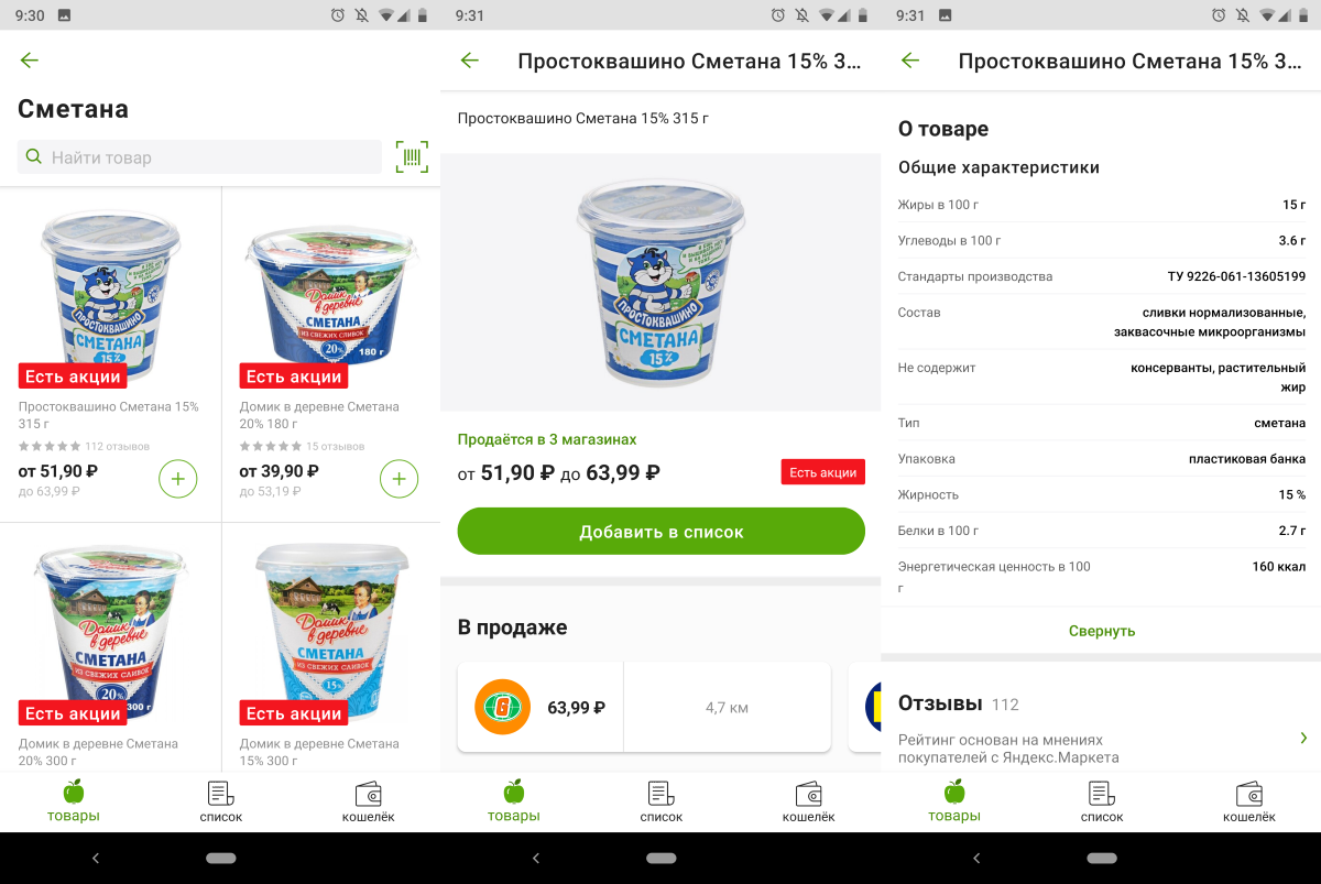 В поиске и карточке товара можно сразу же увидеть, есть ли какие-то акции на него, и сравнить цены в ближайших магазинах. Ознакомиться с подробной информацией о продукте.