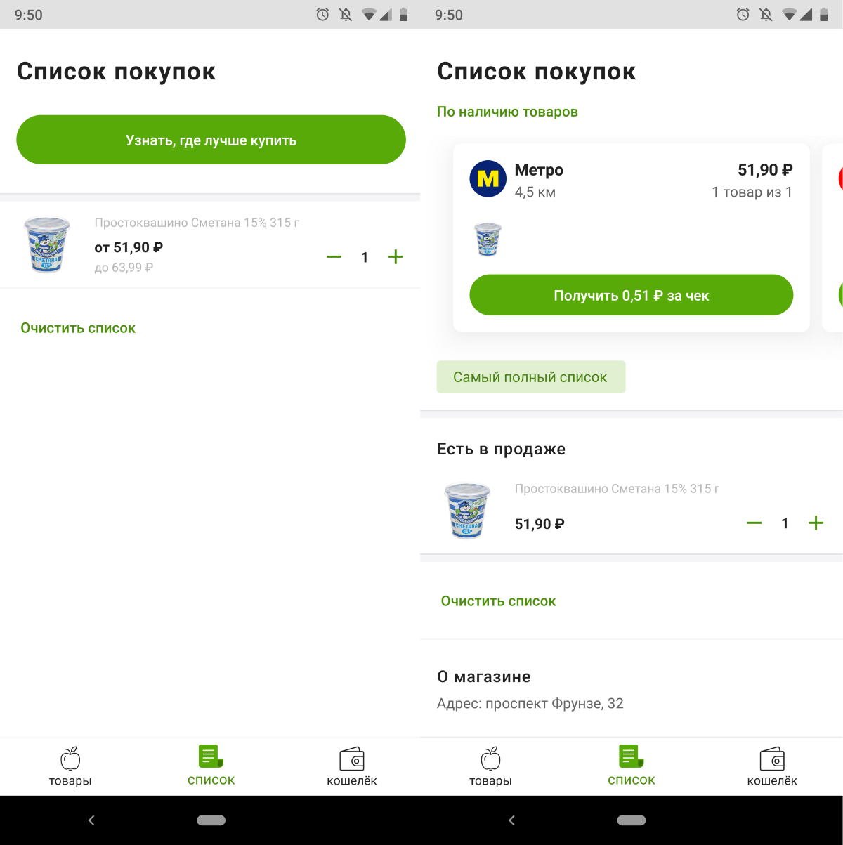В первом случае будет отображаться кнопка с поиском самой выгодной цены. Во втором — информация по наличию в выбранном и ближайших магазинах и краткая информация с суммой кэшбека.