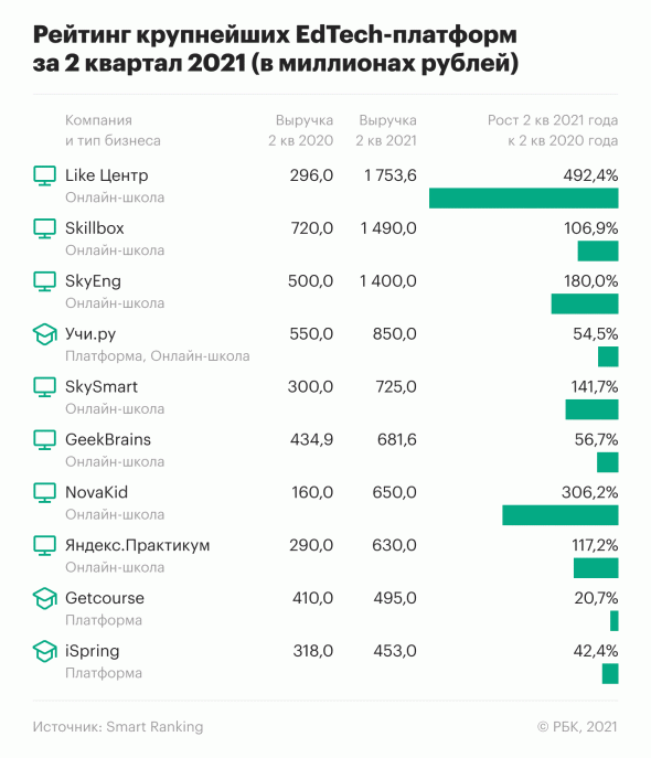 В тройку лидеров также вошла компания SkillBox (увеличение выручки с 720 млн до 1,5 млрд рублей, т. е. рост на 106,9%) и онлайн-школа SkyEng, чья выручка выросла с 500 млн до 1,4 млрд рублей (рост на 180%).