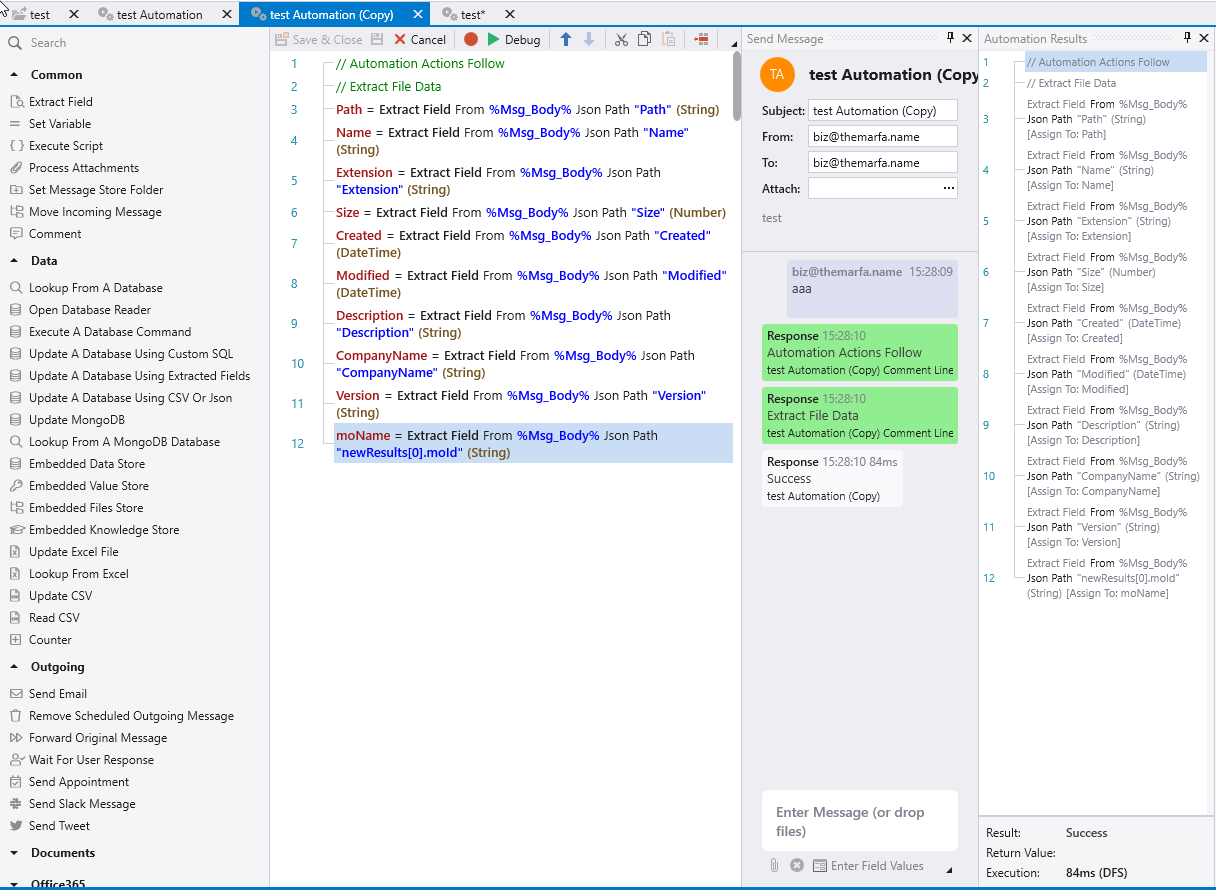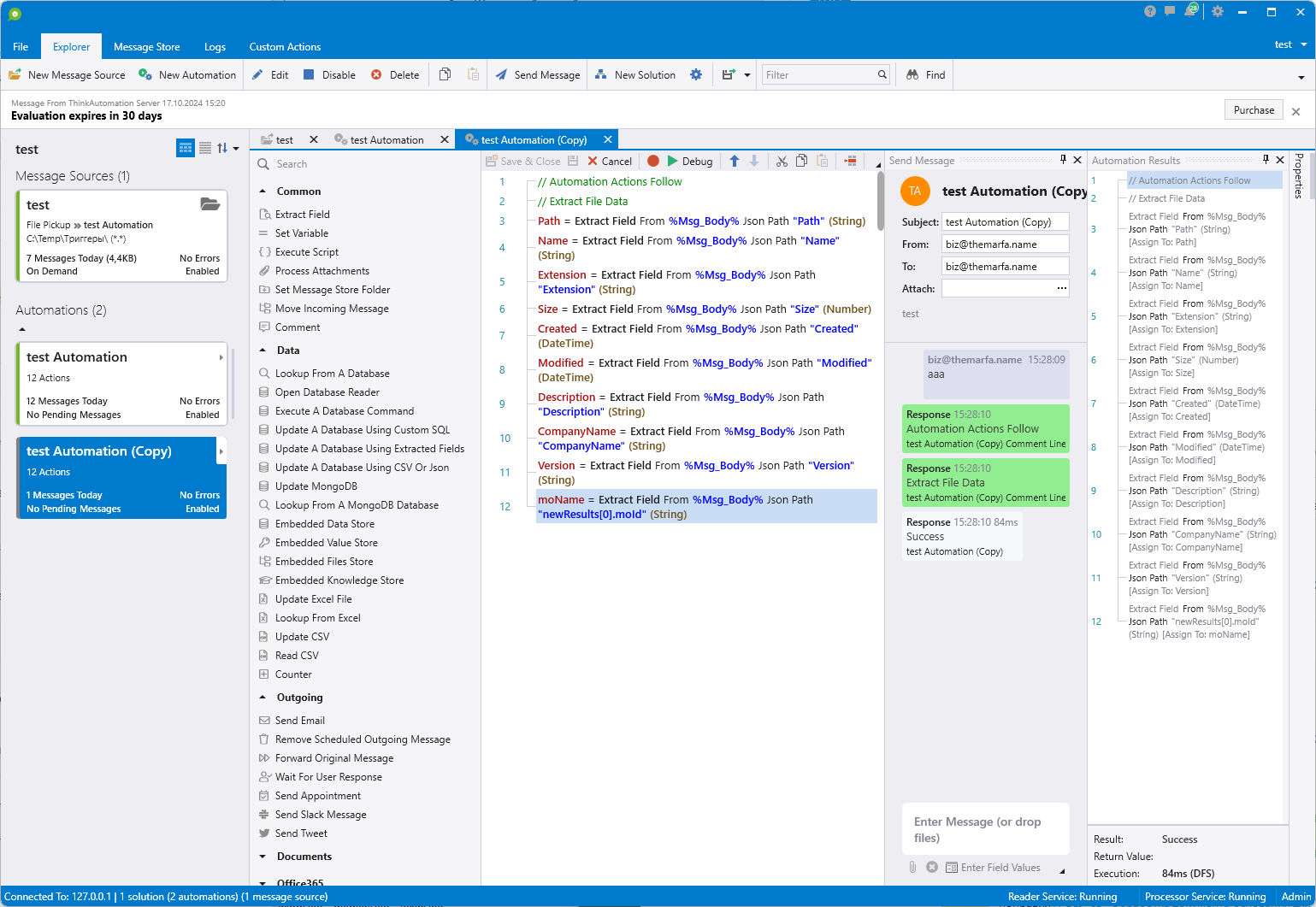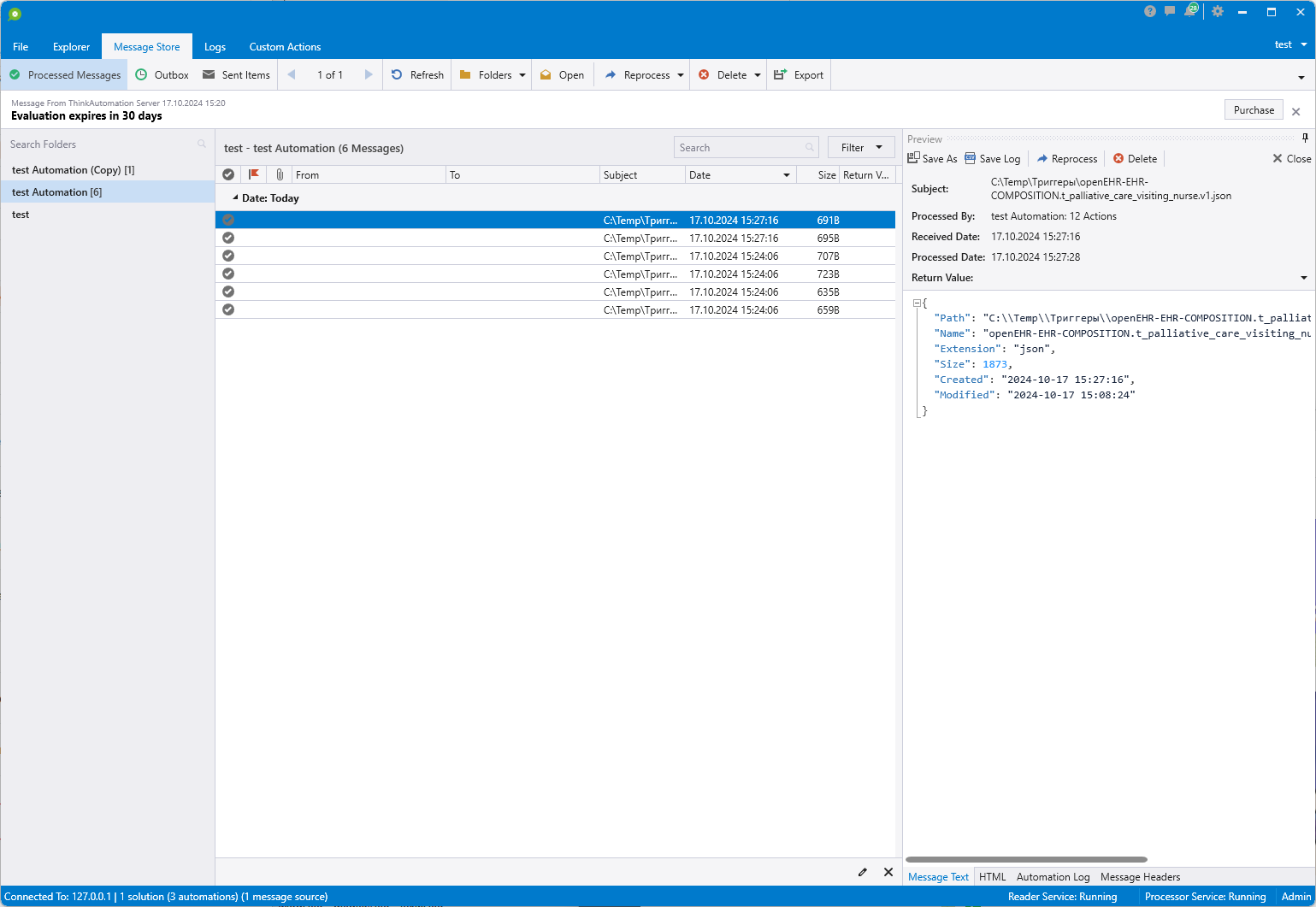 Как и в случае с IDE, алгоритм обработки можно дебажить и проверять результат. И в случае если всё работает, на вкладке Message Store вы будете получать новые письма с результатом работы автоматизатора.