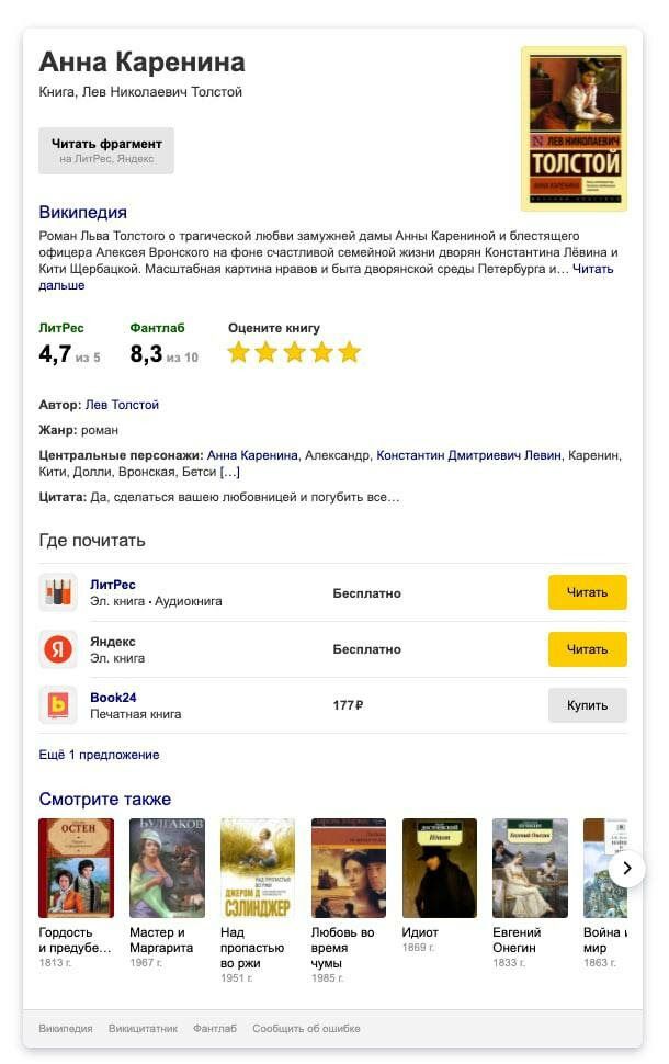 Поиск книг в российской поисковой системе стал ещё совершеннее: теперь в одном ответе будут объединены результаты из крупных интернет-магазинов и компаний-партнёров. Уже с поисковой страницы читатели могут начать знакомиться с текстом произведения, скачать книгу, узнать цену в интернет-магазине, быстро перейти на сайт для оформления заказа. Поиск отображает тексты в электронном, бумажном и аудио форматах.