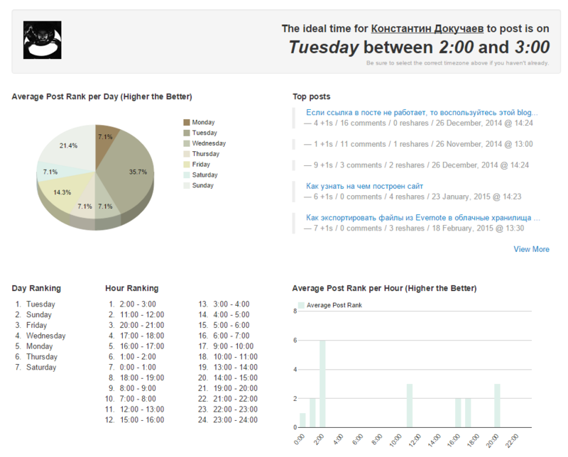 Сервис Timing+ позволяет узнать, когда вам лучше всего выкладывать ваши посты в Google+. Все, что нужно - залогиниться и указать ваш часовой пояс. После чего сразу же любоваться результатами: